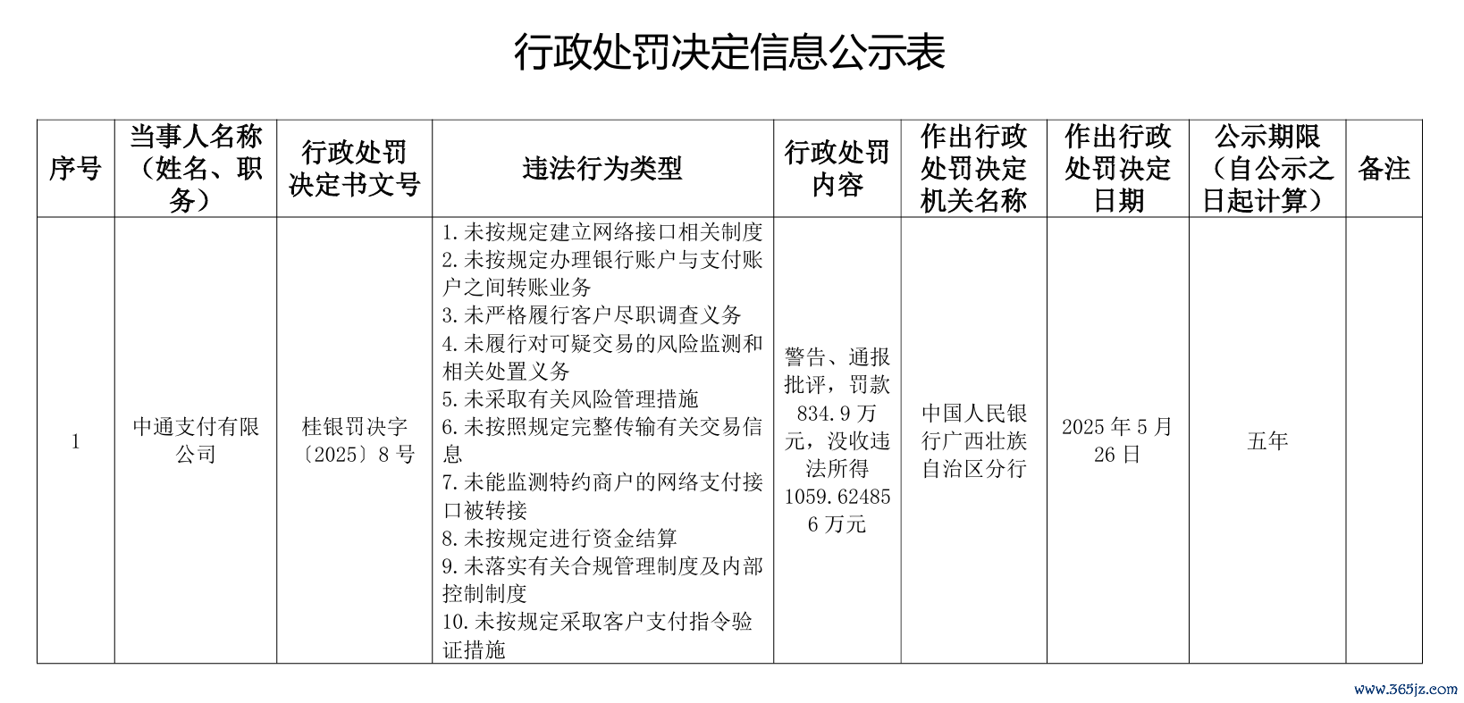 日前,中国人民银行广西壮族自治区分行公布的行政处罚决定信息公示表显示,中通支付有限公司(以下简称中通支付)被警告、通报批评,罚款834.9万元中兴证券,没收违法所得1059.62万元,罚没金额合计1894.52万元。