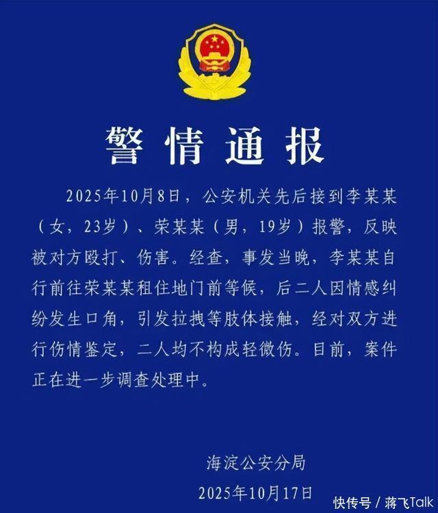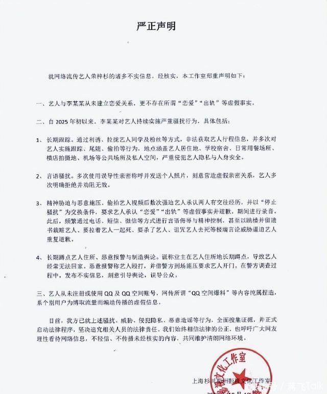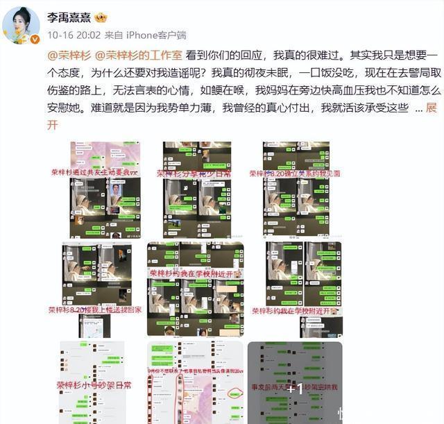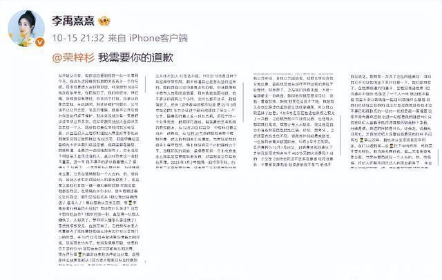 2025年10月15日深夜9点多,自称是荣梓杉前女友的李禹熹发长文称:“我需要你的道歉”。 里面爆料出打人、至少与3名女性暧昧脚踏多条船,后面发的内容甚至里面还有两人的聊天记录。
